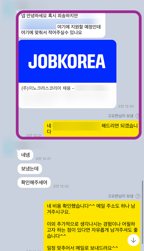 최종적으로 자소서 전체를 점검하고, 오탈자 및 문법 오류를 수정했습니다. 그리고 지원자분에게 자소서를 제출하도록 안내했습니다.