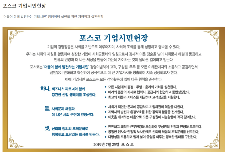 ✔ 비전: 더불어 함께 발전하는 기업시민 (Business with POSCO) – 이해관계자와의 공존, 공영을 추구하는 경영이념