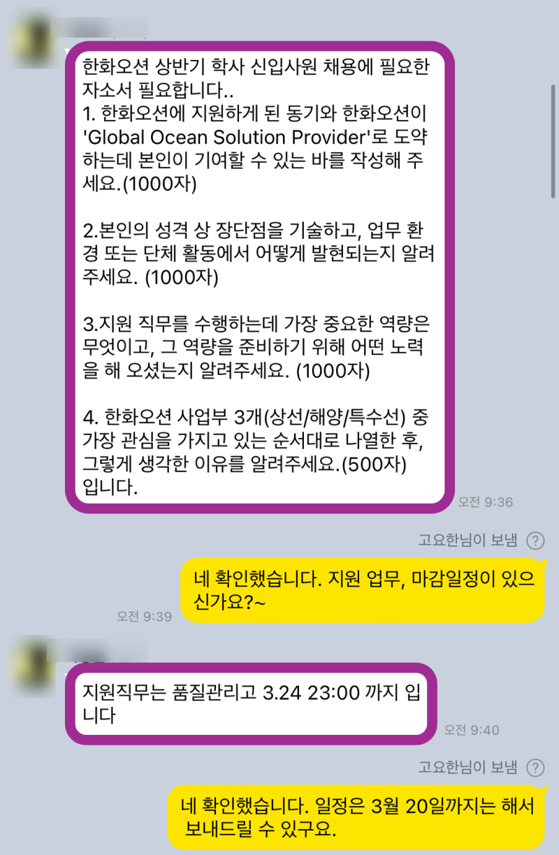 안녕하세요! 👋 제가 매년 2,000명 이상의 지원자분들과 함께 취업 여정을 걷고 있는 자기소개서 전문가입니다! 😊 이번 한화오션 서류 합격 소식은 정말 뿌듯한 케이스였는데요. 완전 긴급 건으로 들어왔던 자소서 첨삭 후기였어요! 매년 다수의 합격 사례를 보유하고 있는 저와 함께 이번 한화오션 채용공고의 자소서 항목과 문항 분석, 그리고 자기소개서 작성하는 방법까지 모두 살펴볼까요? 🚀