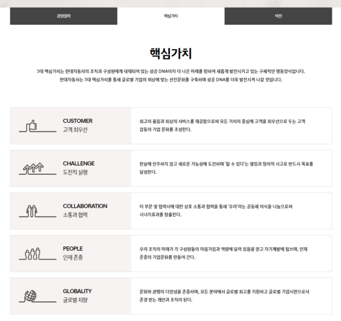 핵심 가치: 고객 최우선, 혁신, 도전, 소통과 협력, 인재 존중