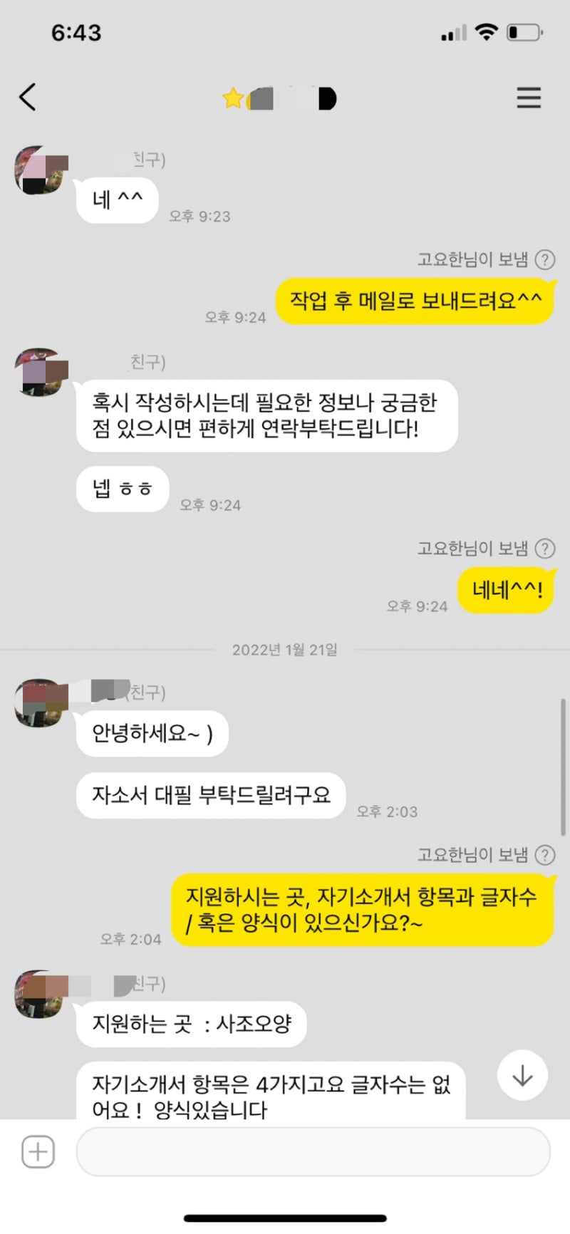 저는 지원자분과의 긴밀한 소통을 통해 잠재력을 최대한 끌어내고, 각 기업의 인재상과 직무 요구사항에 완벽하게 부합하는 자기소개서를 완성해 드립니다. 단순히 글쓰기를 대행하는 것이 아니라, 지원자 본인의 경험과 강점을 명확하게 파악하고 이를 가장 효과적으로 전달할 수 있도록 돕는 ‘성공적인 취업을 위한 파트너’가 되어 드립니다. 여러분의 꿈을 현실로 만들기 위한 여정에 제가 함께 하겠습니다. 언제든지 편하게 문의해주세요!
