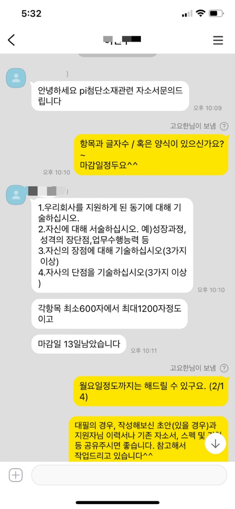솔직히 말씀드리면, 김님의 초고는 경험 나열 위주였고, pi첨단소재에 대한 이해도가 부족해 보였습니다. 또한, 직무 관련 강점을 명확하게 어필하지 못하고 있었습니다. 이 부분에서 정말 고민 많이 하셨을 텐데, 제가 옆에서 꼼꼼하게 첨삭해 드렸습니다!