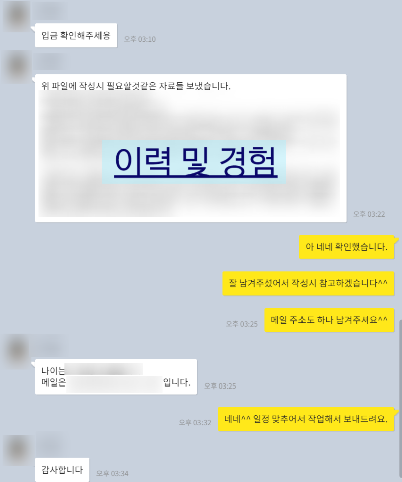 >> 1. 문의 및 상담: 카톡, 전화 등으로 편하게 연락 주세요! 지원 직무, 희망 기업, 마감일 등 자세한 상담을 통해 컨설팅 방향을 잡아요.